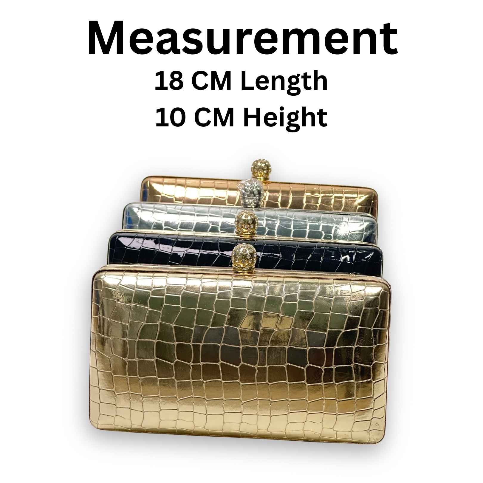 Make a bold statement with the Croc Couture Clutch, where timeless elegance meets modern edge. Crafted from glossy crocodile-textured material, this clutch exudes luxury from every angle. The structured metal frame is complemented by a sleek metal handle and a detachable chain strap – giving you the freedom to carry it your way. Perfect for formal events, night-outs, or anytime you want to stand out.