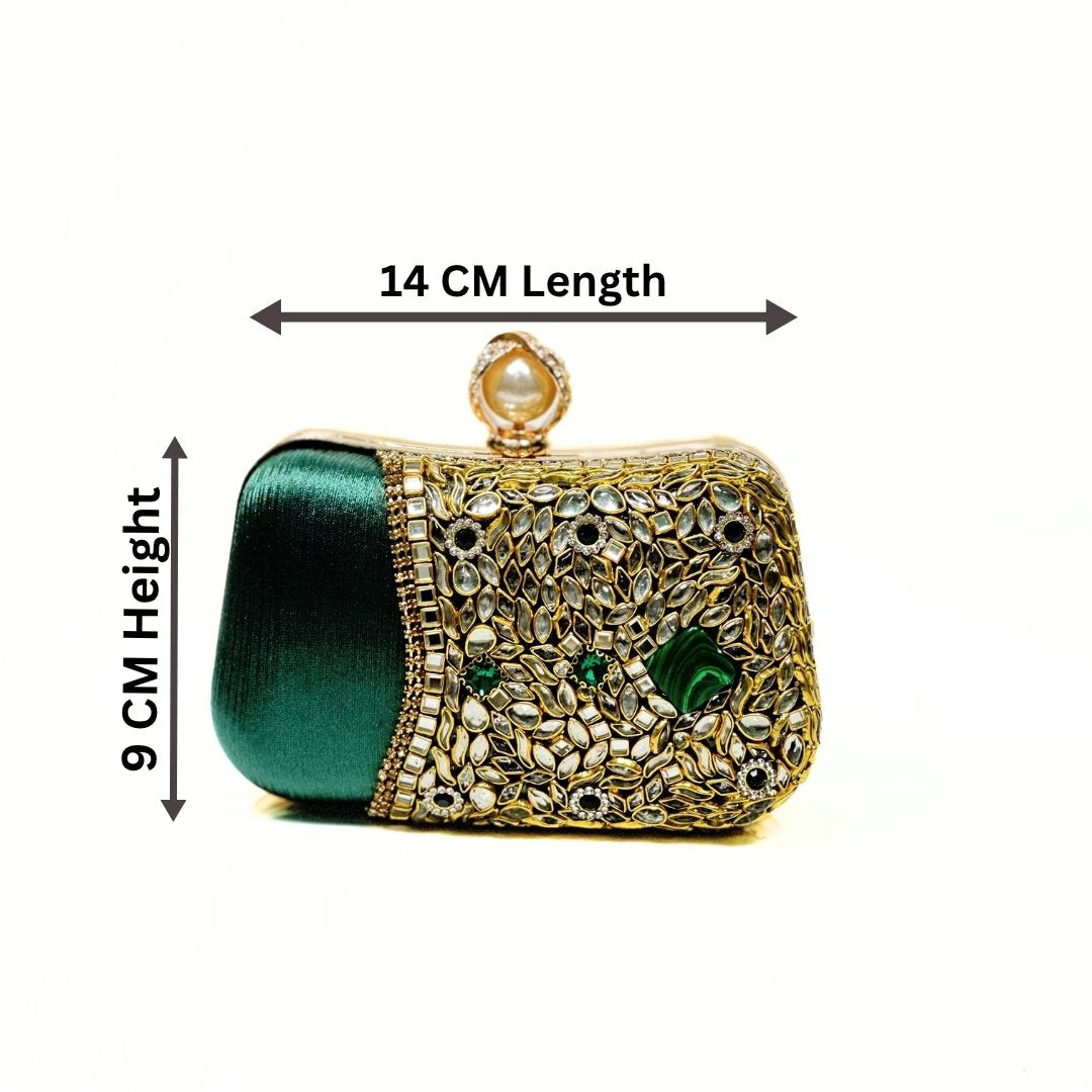 Elevate your festive look with the timeless elegance of the Onyx Kundan Clutch. Designed with a luxurious blend of deep green satin and intricate gold kundan embellishments, this clutch reflects pure sophistication and traditional charm.