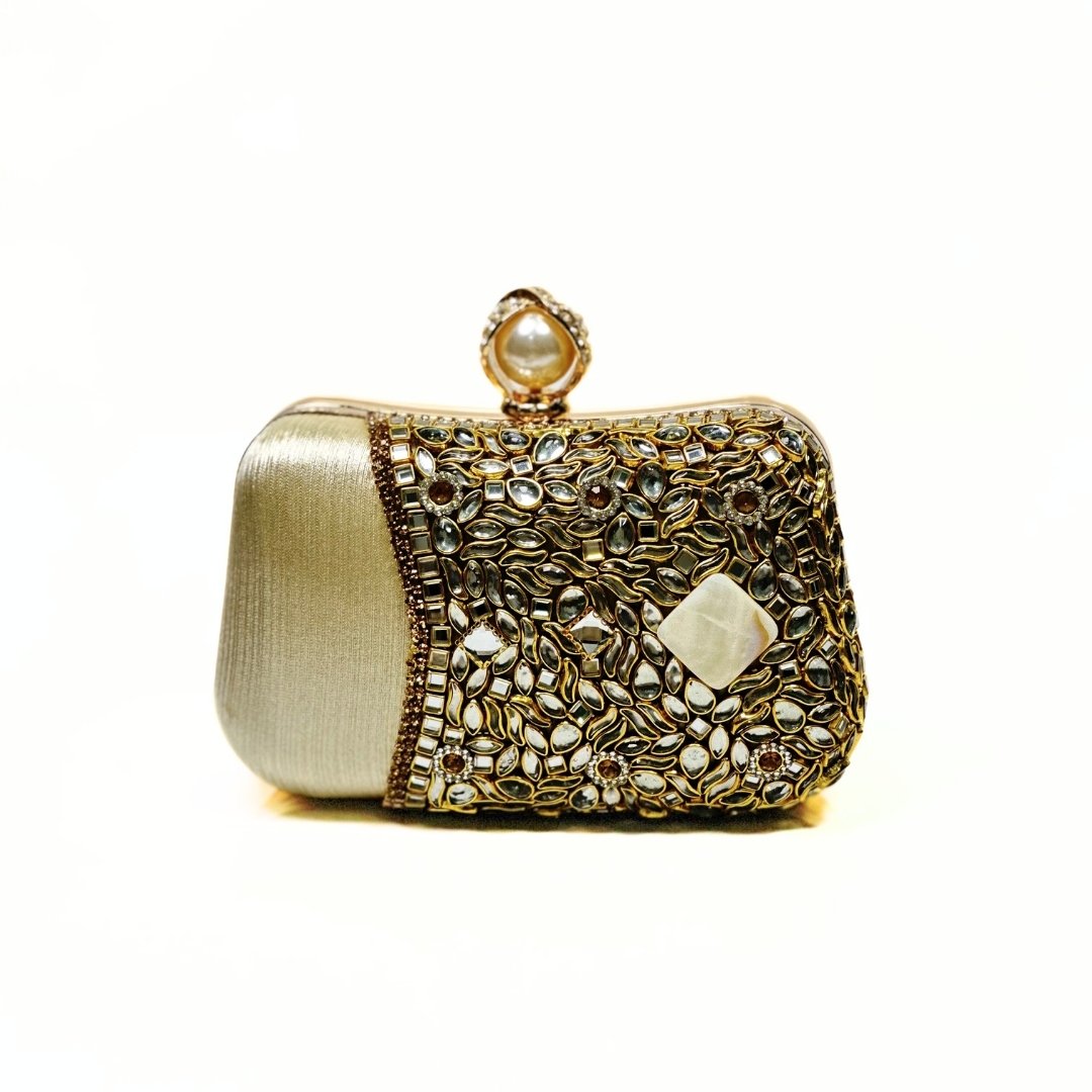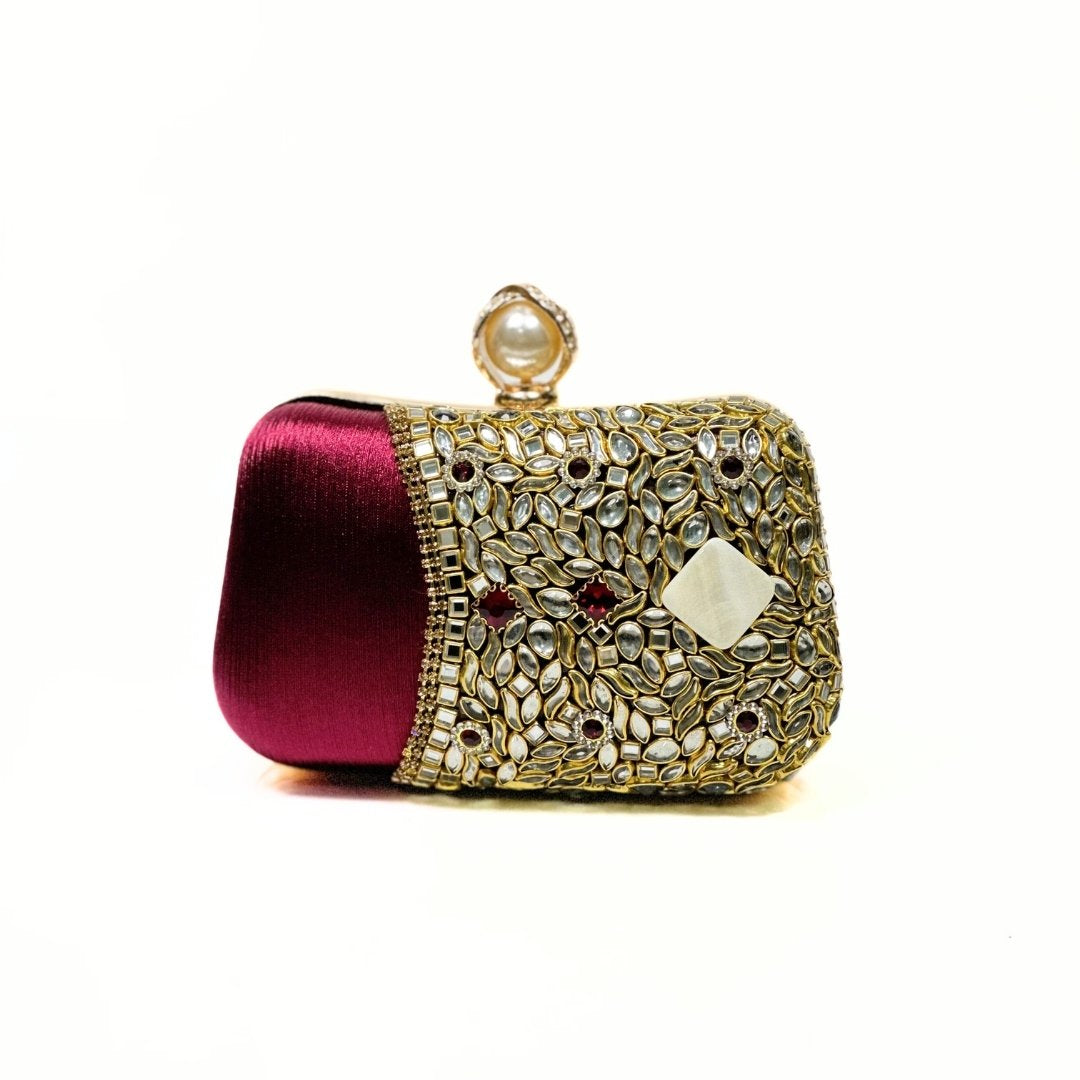 The front is beautifully adorned with detailed stonework and rich onyx accents, creating a regal design that pairs perfectly with both eastern and fusion outfits. The sleek structure and statement clasp add a touch of glamour, making it an ideal companion for weddings, formal events, and festive celebrations.