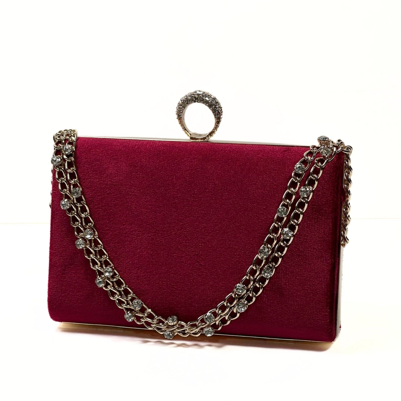 Add timeless elegance to your evening look with the Seraphina Ring Velvet Clutch by Bagsero. Crafted from premium velvet, this luxury clutch bag features a rich, soft texture paired with a statement ring handle for a refined, royal finish. The beautifully designed dual stone chain adds sparkle and sophistication, while the long detachable chain offers flexible styling—carry it by hand, on the shoulder, or crossbody.