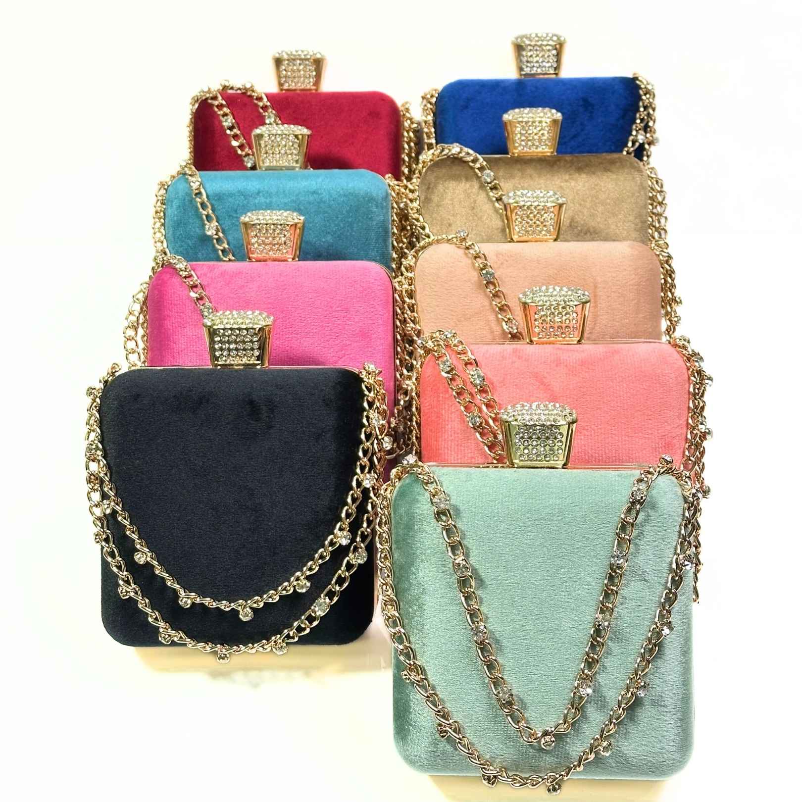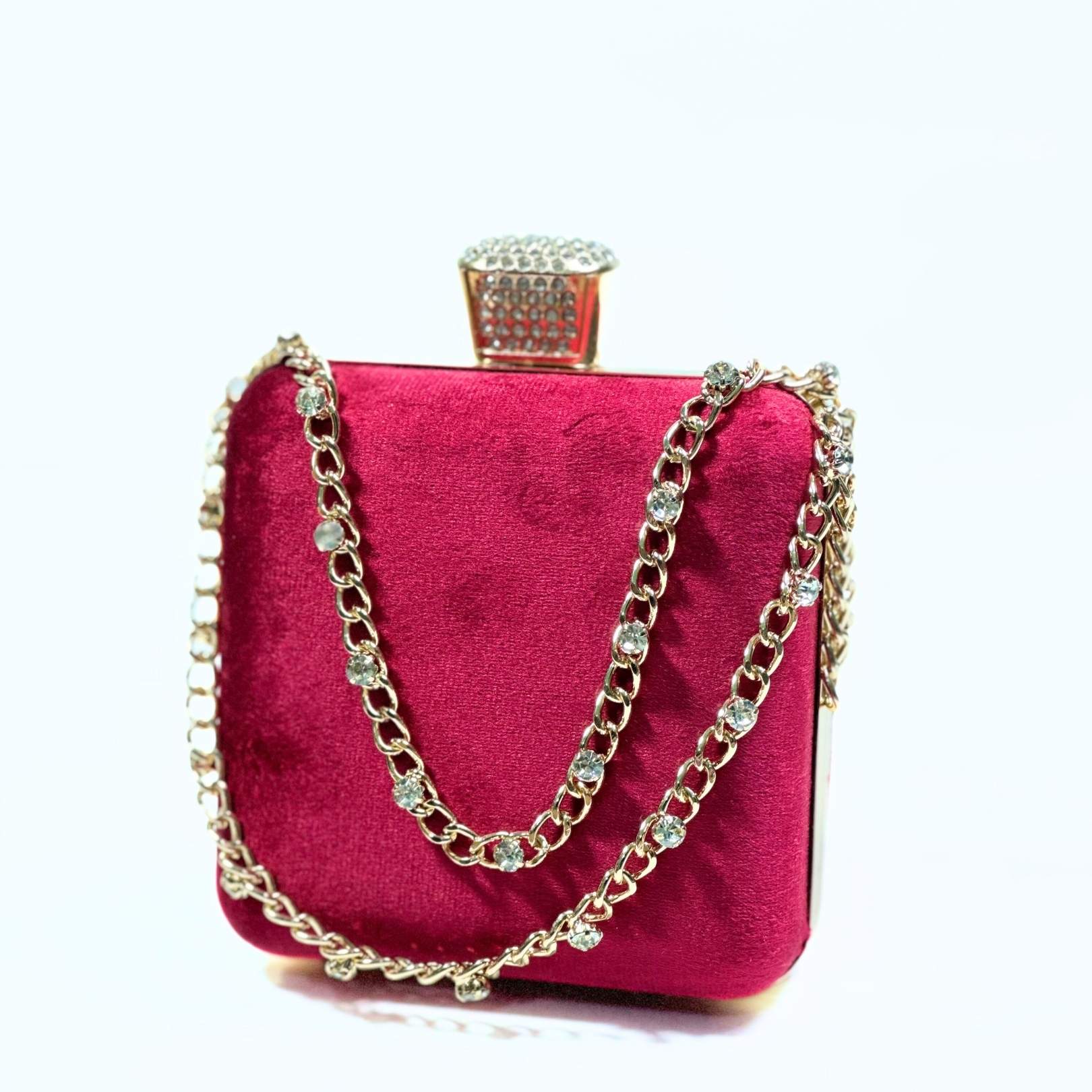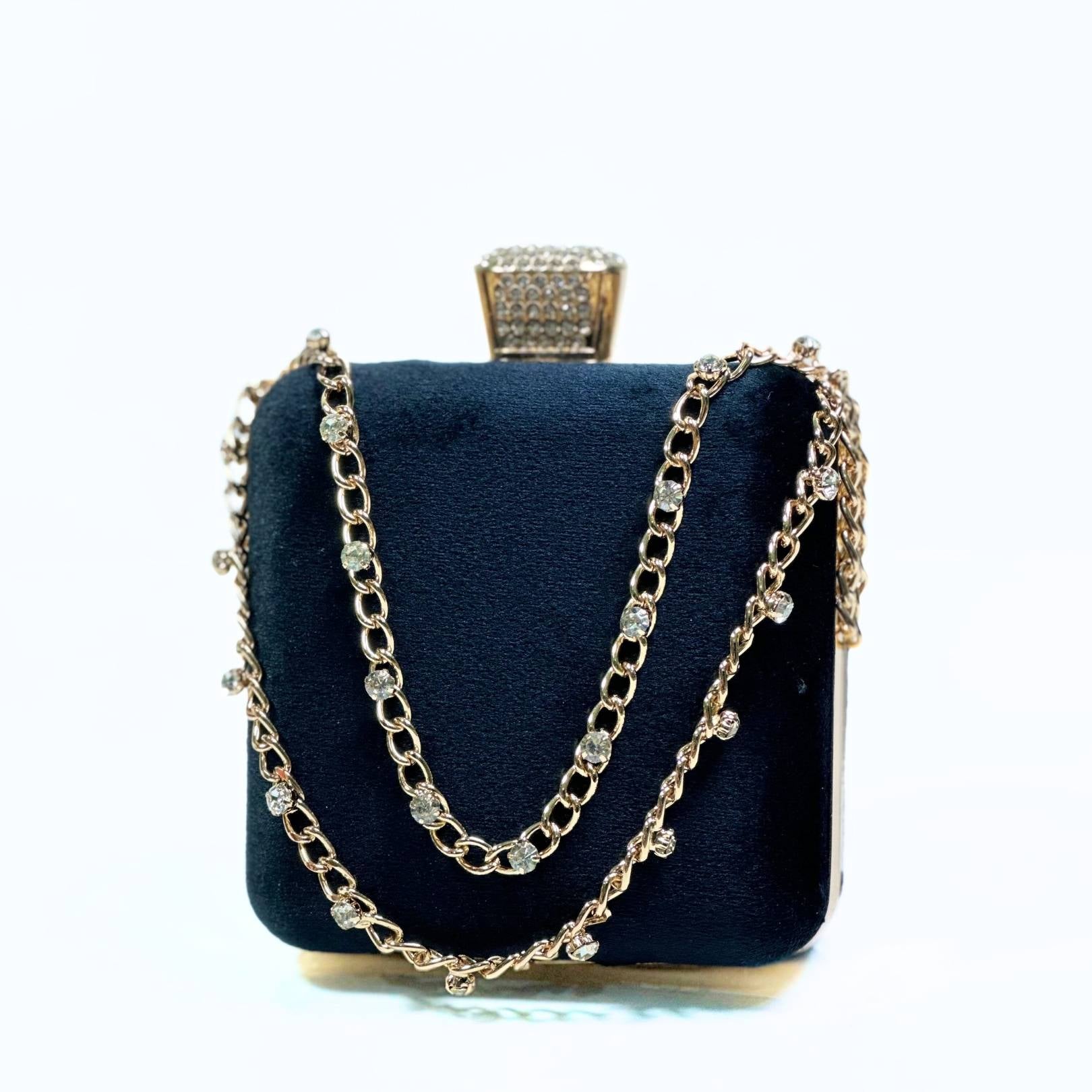Add a dash of elegance to your look with the Stone Chain Velvet Clutch, the perfect blend of style and functionality.