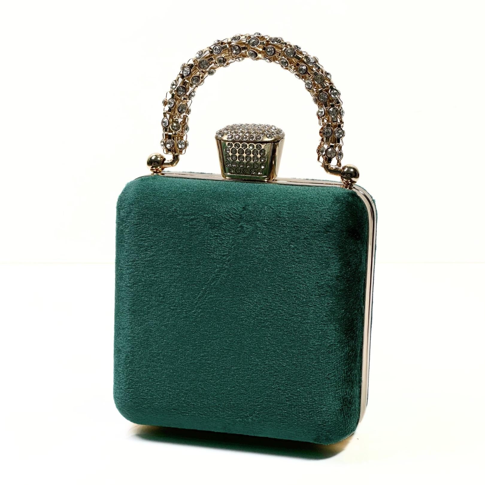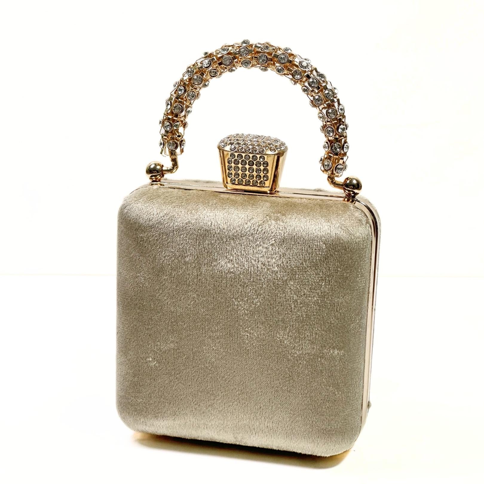 Its compact square design is perfectly sized to hold essentials such as your phone, cards, cash, and makeup while maintaining a sleek, sophisticated silhouette. Whether styled for weddings, parties, bridal wear, or formal evenings, the Veloria Crystal Velvet Clutch is a timeless accessory for every wardrobe.