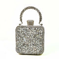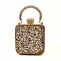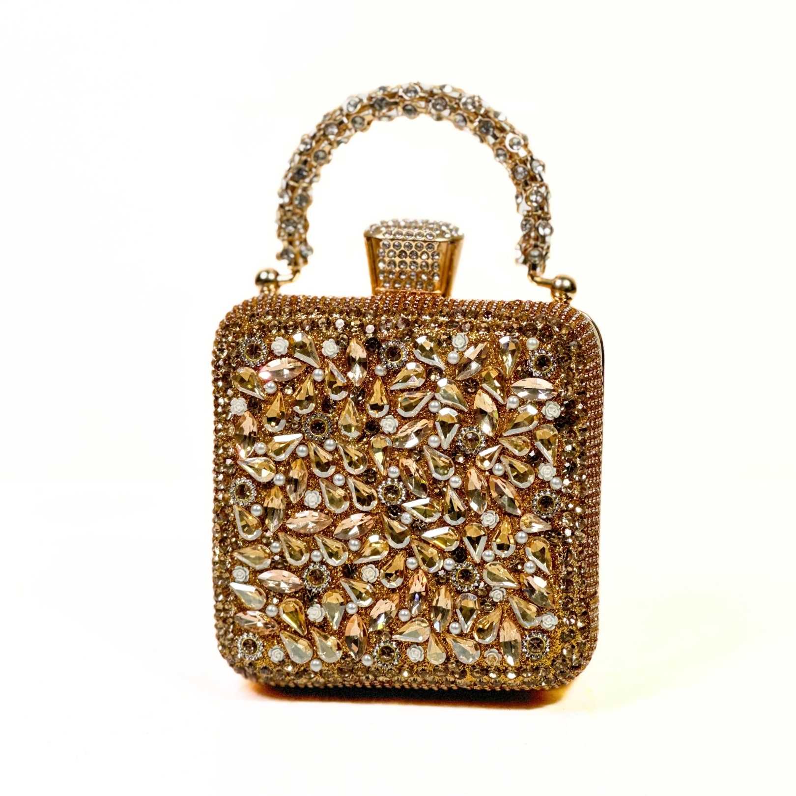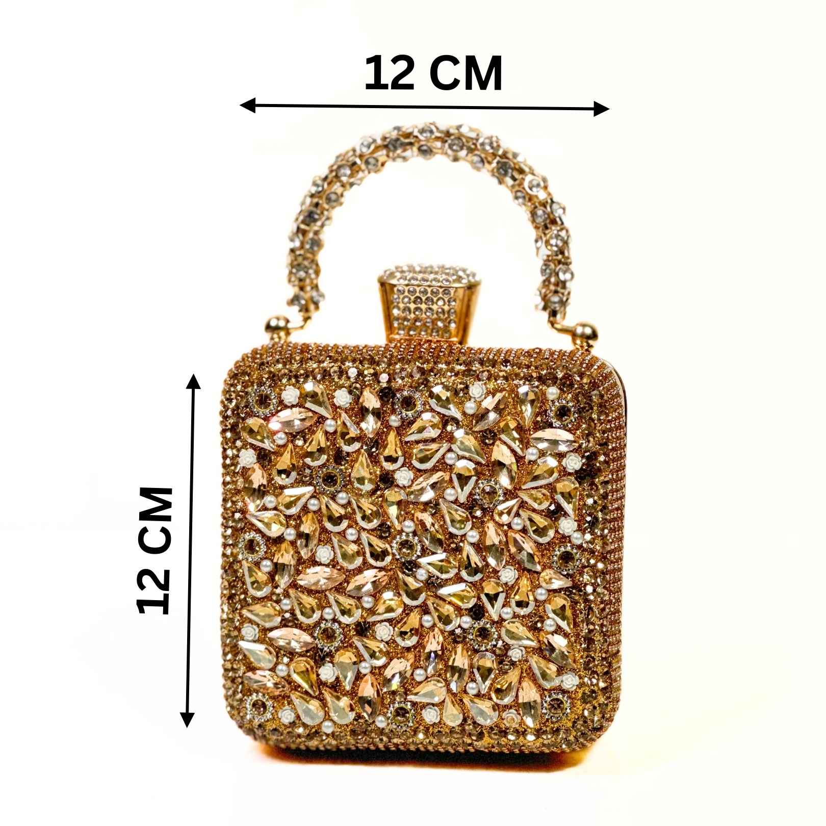The stone-adorned handle adds a glamorous touch, while the detachable metal chain provides versatile styling options — carry it as a statement hand clutch or wear it effortlessly over the shoulder. Its compact yet structured design makes it perfect for carrying essentials without compromising elegance.